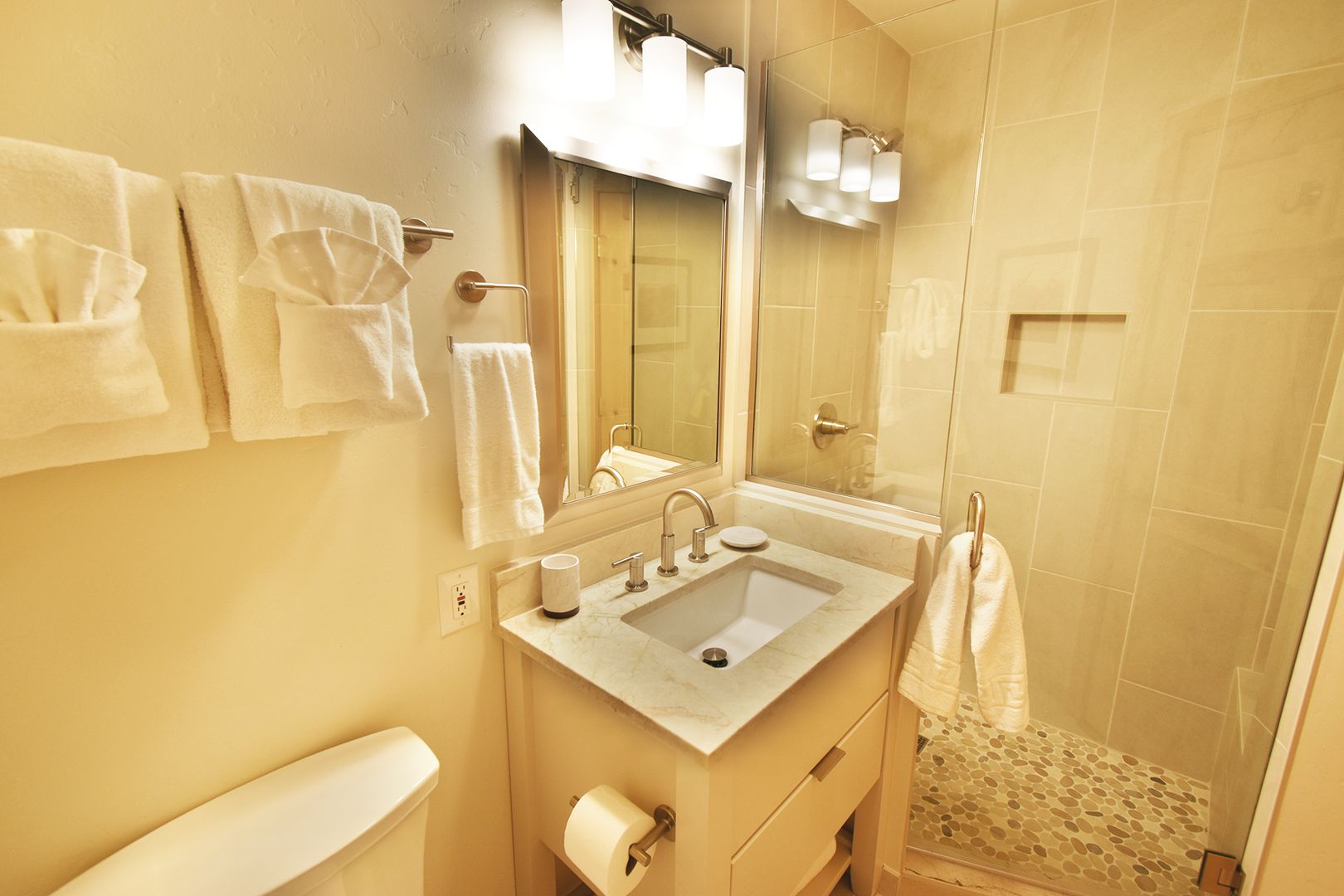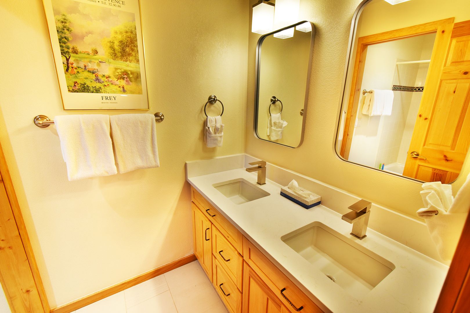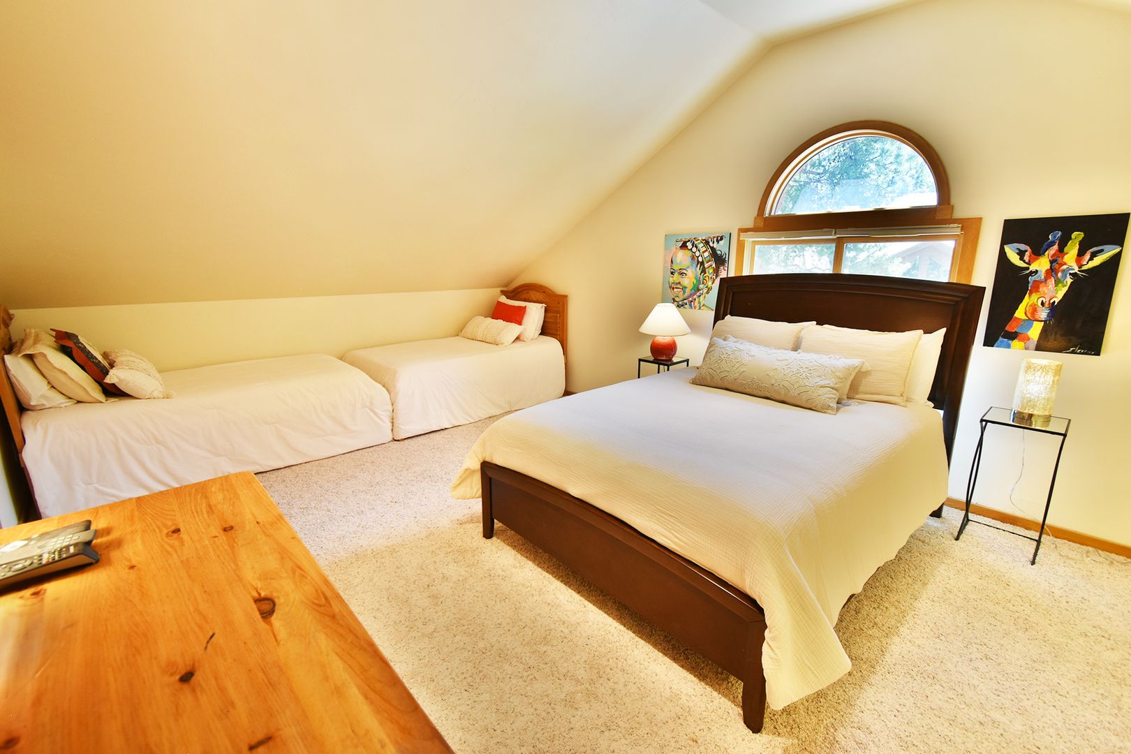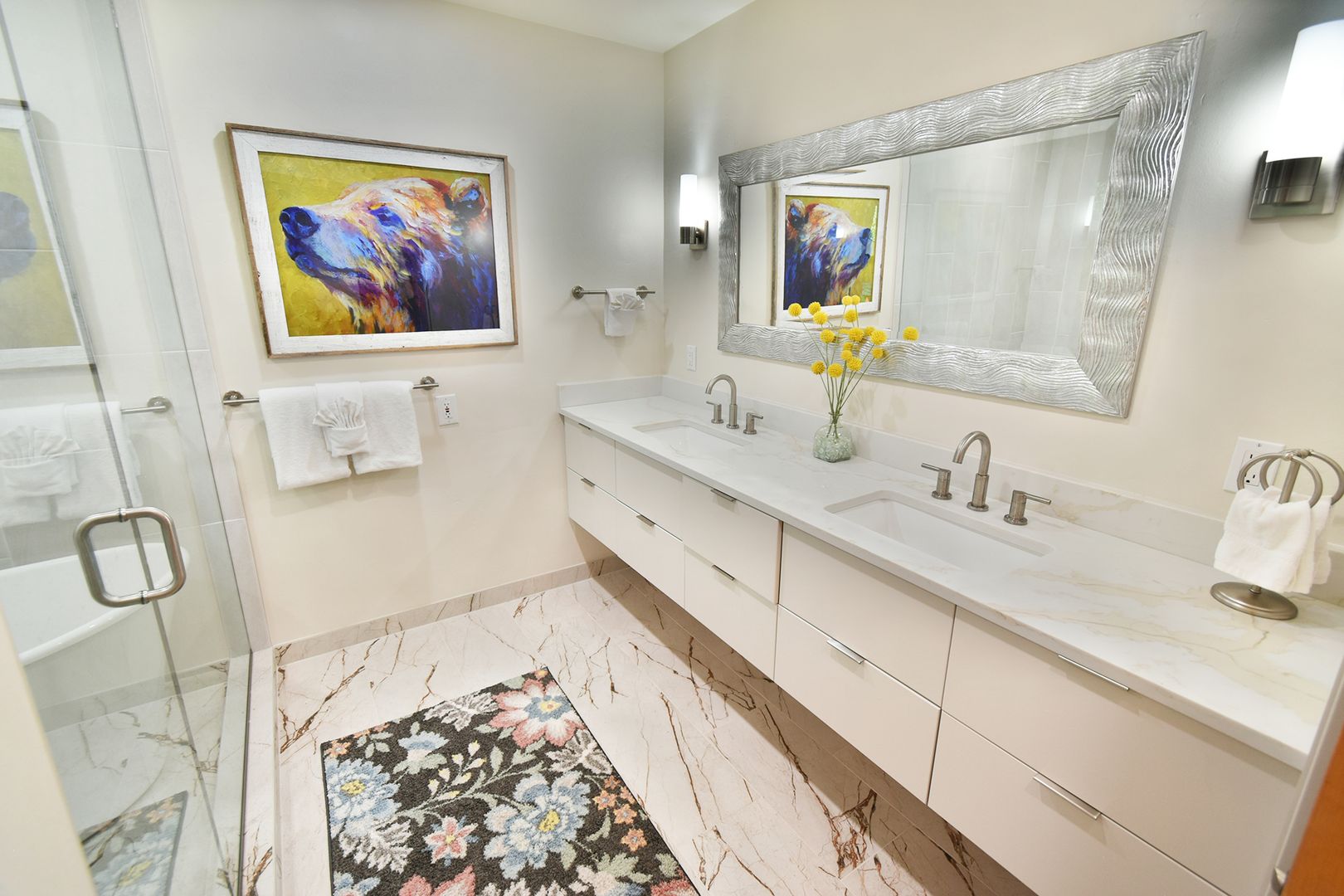 With 3,200 sq. ft. of living space, this home comfortably sleeps 10 guests. The inviting primary bedroom boasts a king bed, a walk-in closet, a double vanity, and private deck access overlooking the tranquil Tenmile Creek. The second bedroom also features a king bed, the third has a queen, and the fourth is perfect for families, offering both a queen and two twin beds. In addition, two spacious living rooms provide ample space for relaxation, one of which includes a queen sofa sleeper.