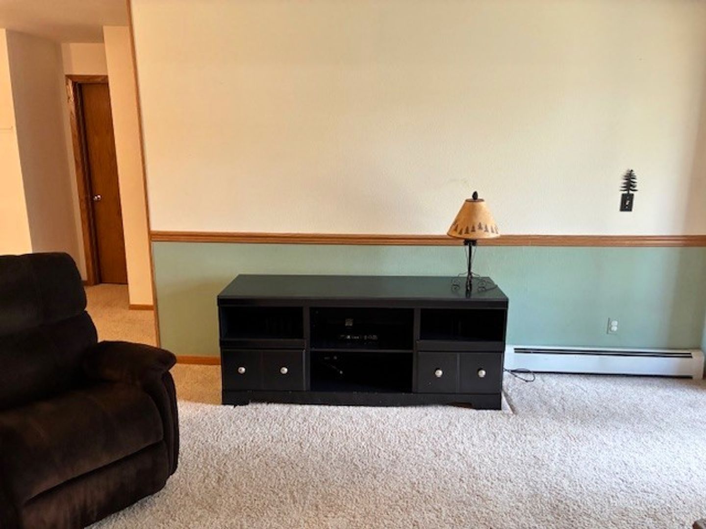 Step inside to a well-maintained living space featuring a cozy wood-burning fireplace, private deck, full-size washer and dryer, and partial furnishings—including a couch, recliner, TV stand, and end table.